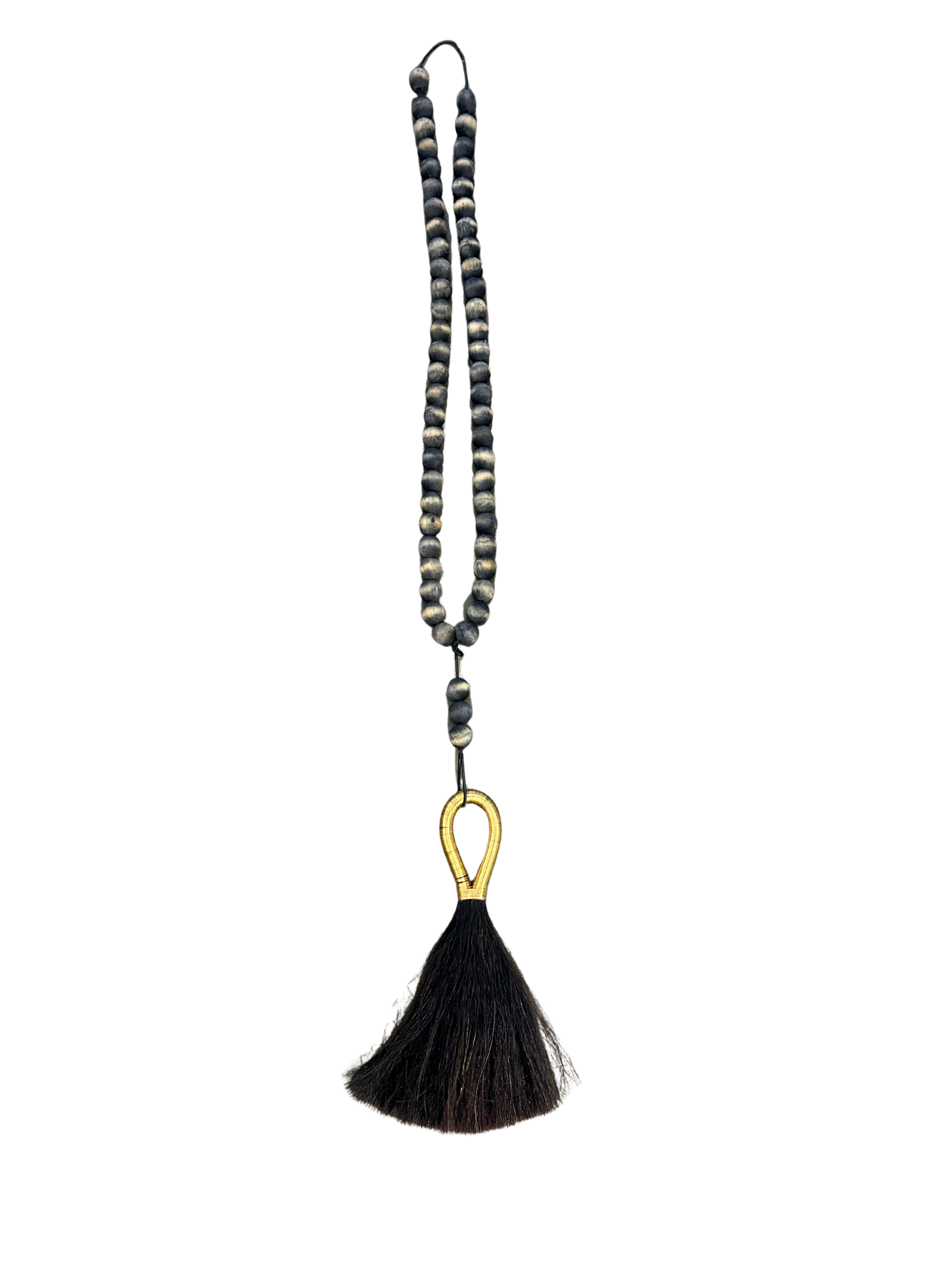 A striking decorative tassel made from natural horsehair, featuring a wrapped gold loop and matte black wooden beads. Perfect for styling on hooks, door handles, or tabletops, this piece adds texture and artisanal charm to any space.